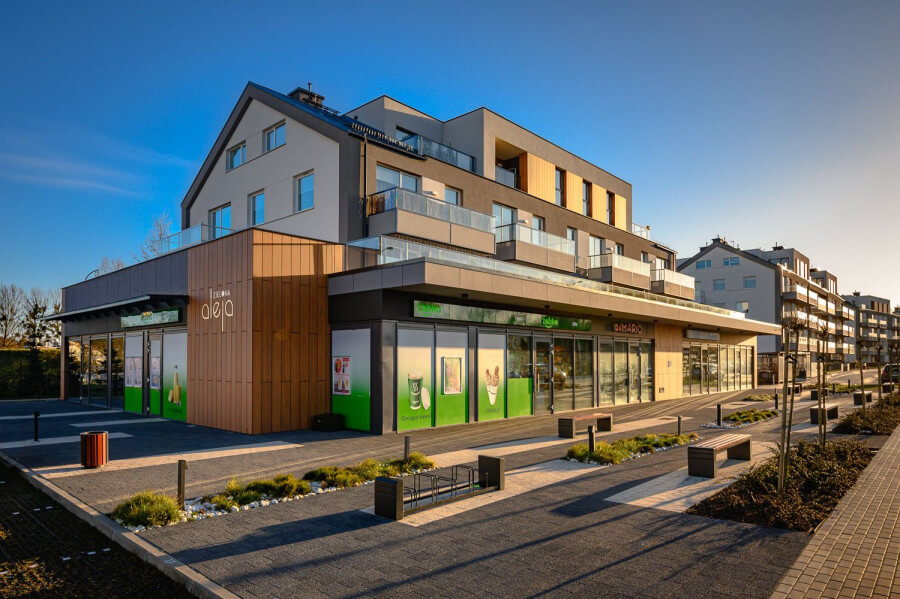 W parterze budynku znajdują się lokale usługowe.